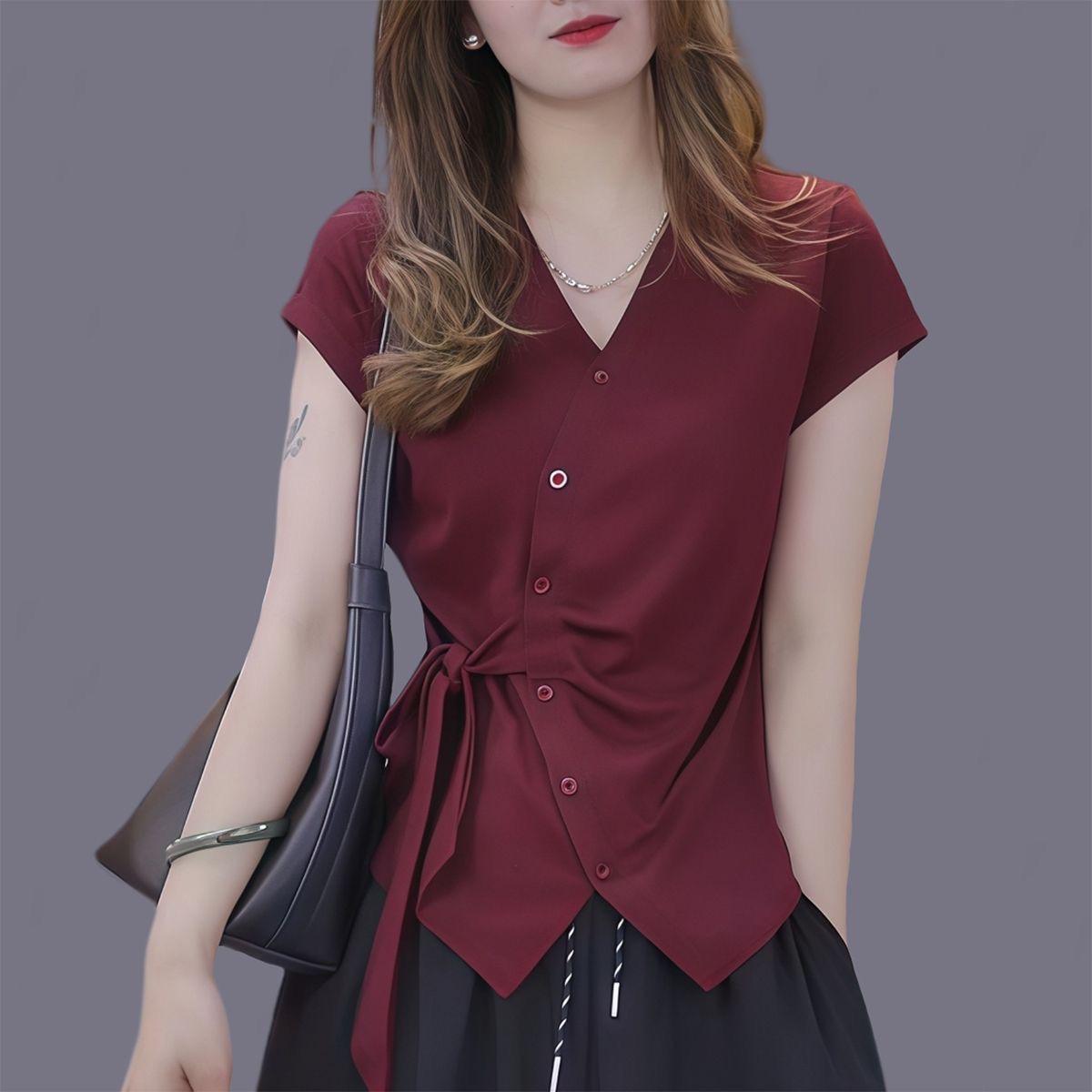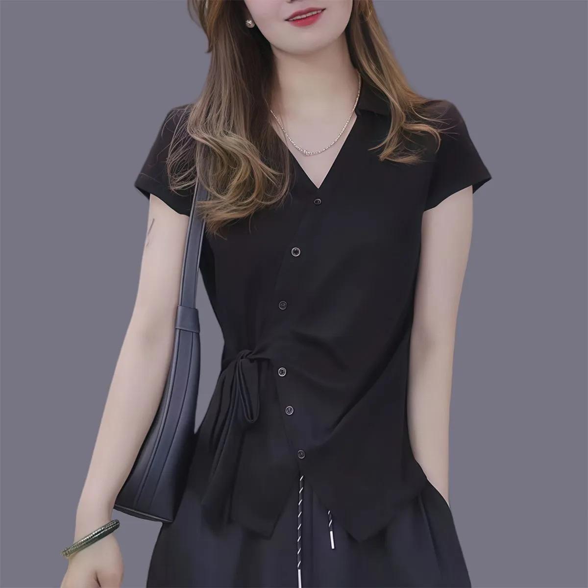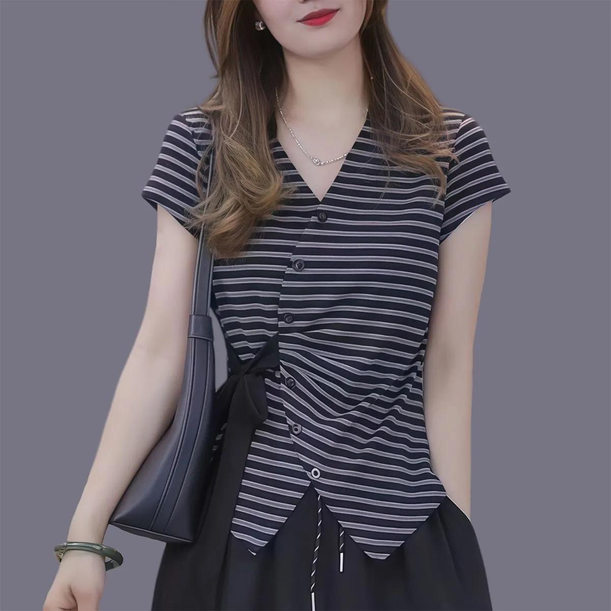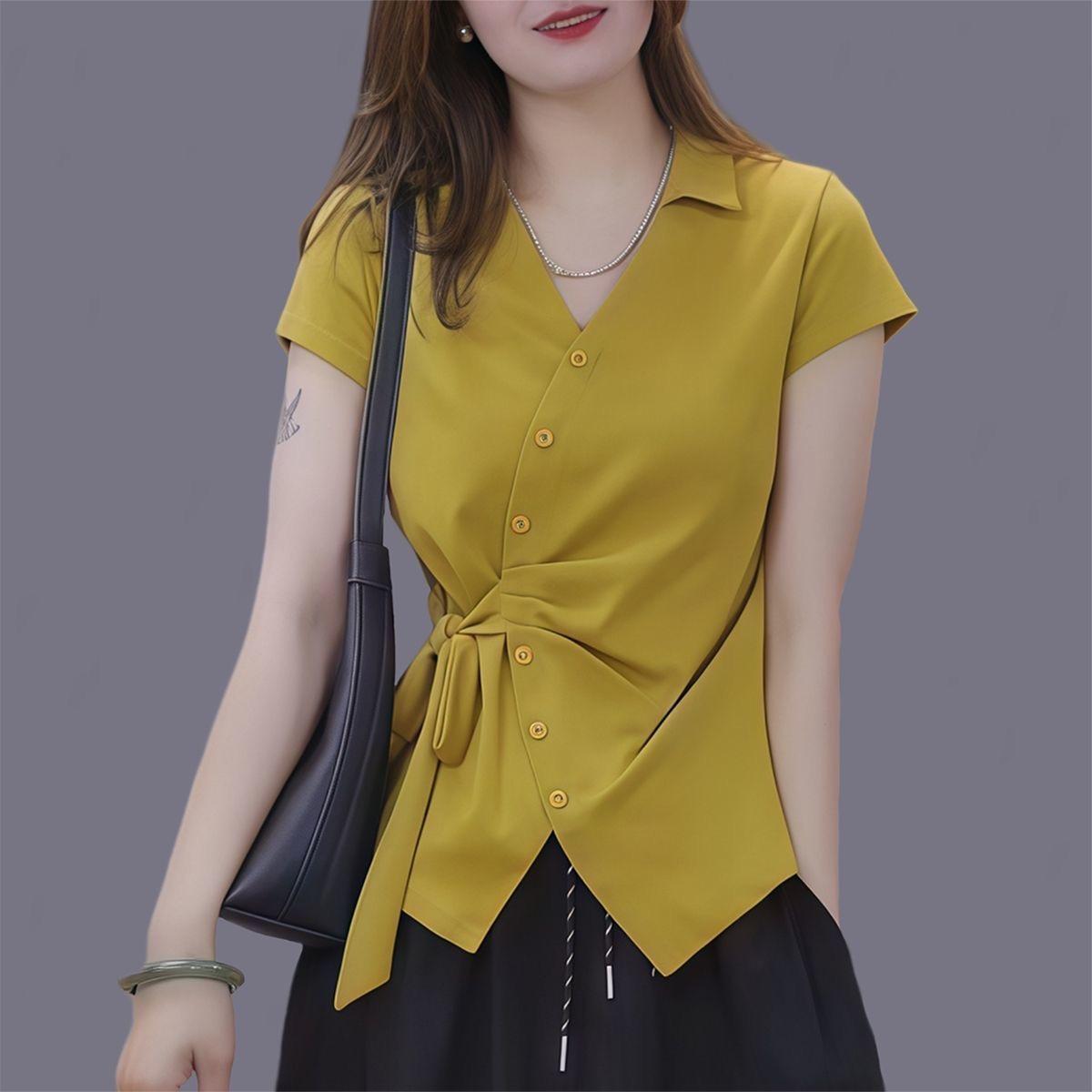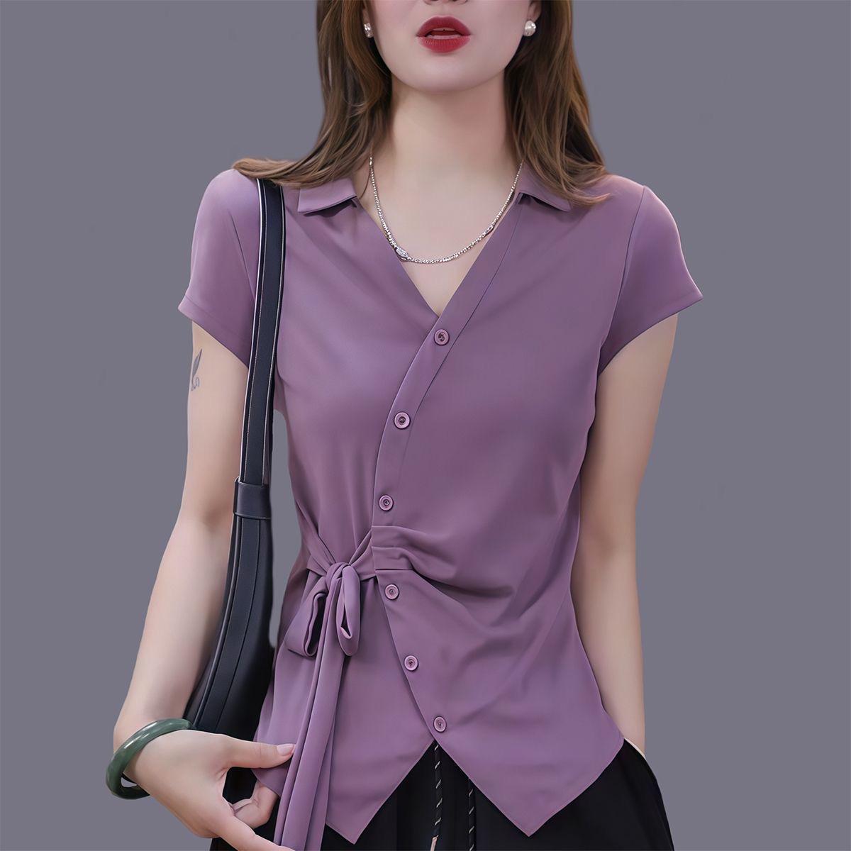 夏季新款綁帶設計T恤 遮肉顯瘦顯白 彈力親膚透氣 領口服帖不走光